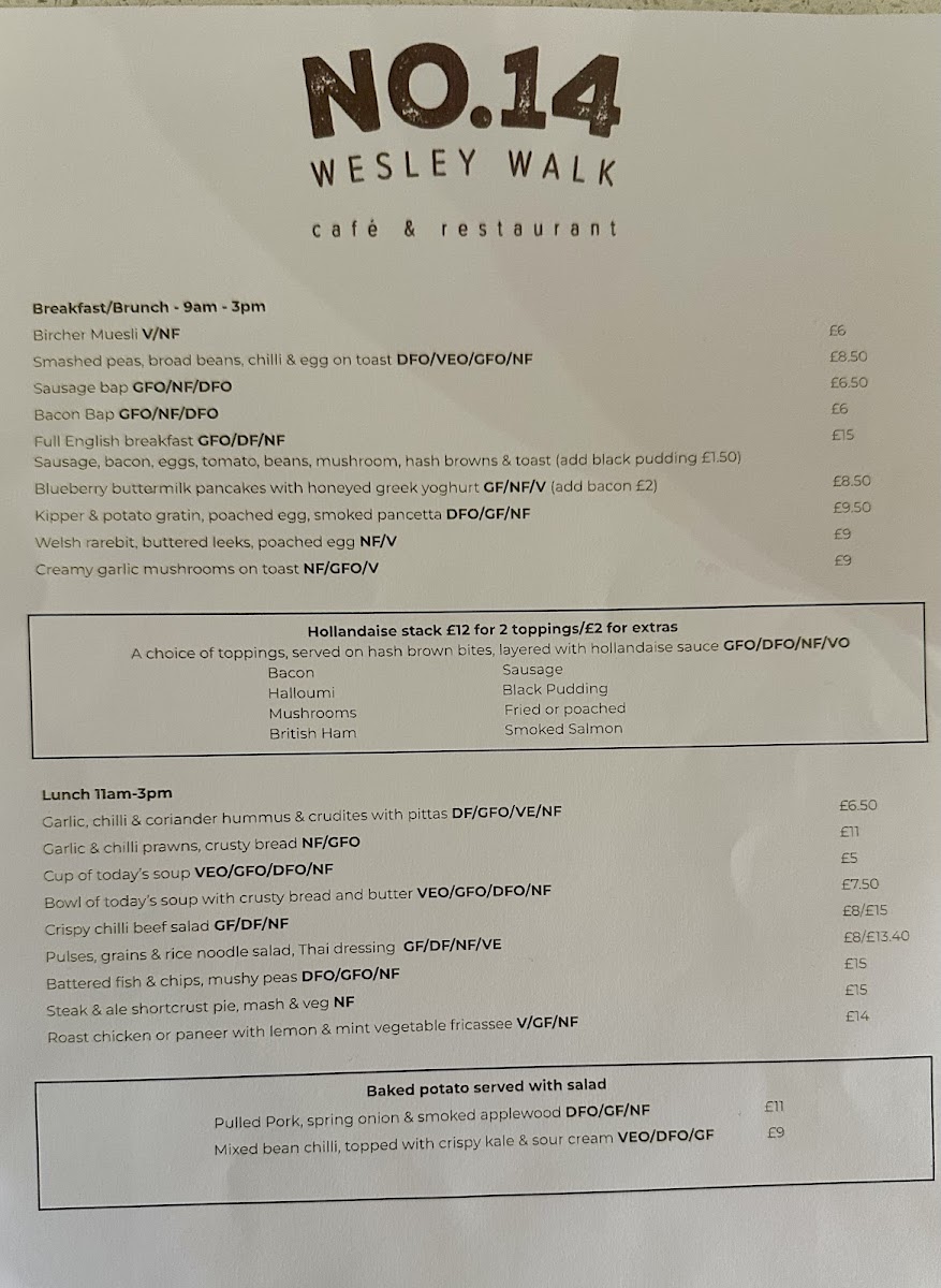 The menu at No.14 Wesley Walk is thoughtfully structured to cater to various dining occasions throughout the day. It features a range of offerings grouped into Breakfast and Brunch, Lunch, and Sandwiches & Snacks, providing options for early meals, light lunches, and casual bites.